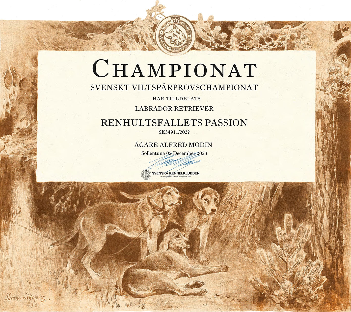 Viltspårchampion som 1-åring – tre raka 1:a pris, utan omprov. Skottfast/oberörd vid skottprov. Tränas och visar fina anlag i apportering, personsök, specialsök, nose work och rallylydnad. Stor arbetslust i skog, mark och vatten.