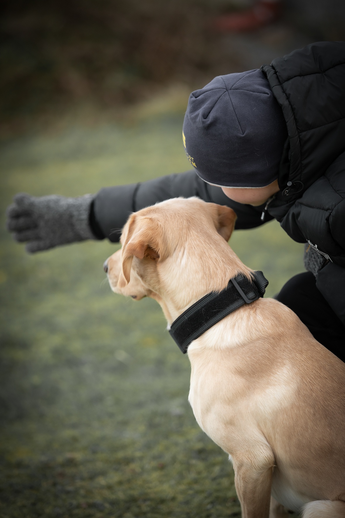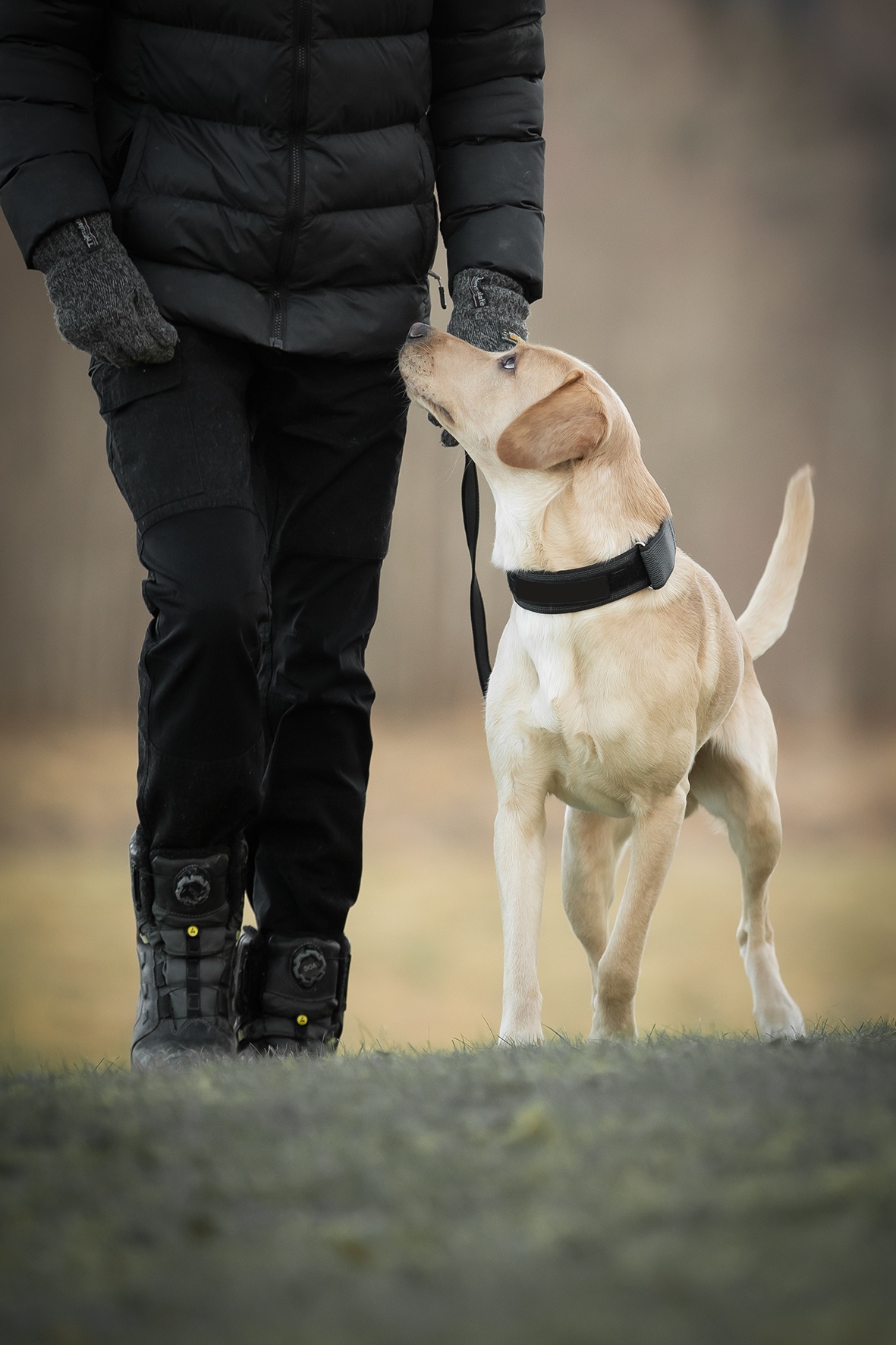 Han lyser upp när han får “jobba” och tar glatt allt vi erbjuder: bära ut soporna, hämta posten och bära det vi pekar på. Han kommer stolt tillbaka, lämnar fint i hand och står sedan redo för nästa uppdrag. Det märks hur mycket han tycker om att göra rätt—han söker vår blick, tar instruktioner mjukt och blir genuint lycklig när han får beröm. Den där viljan att prestera och göra oss nöjda är ett av hans finaste drag.