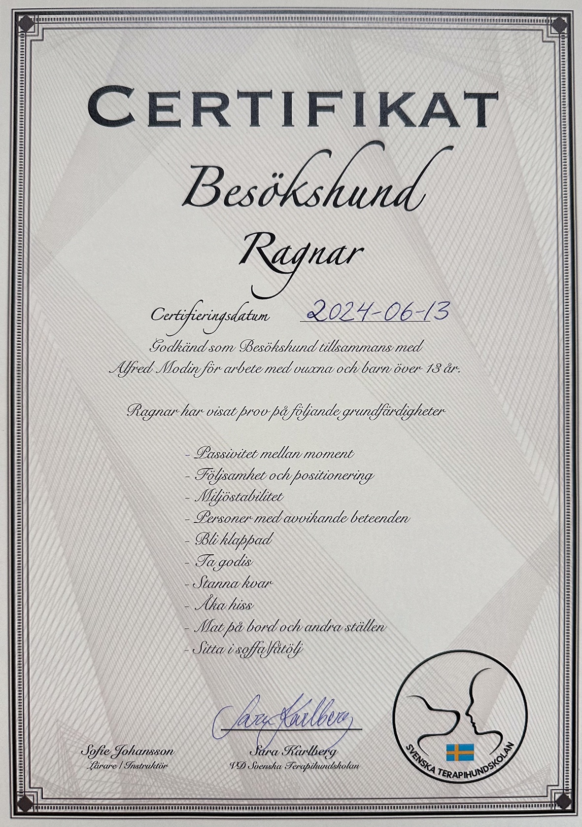 Godkänd 2024-06-13 som besökshund tillsammans med Alfred Modin.